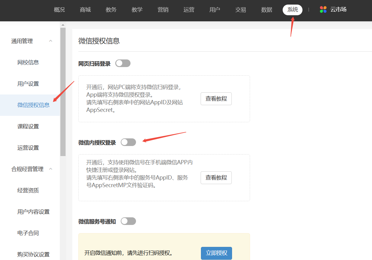 关闭路径:【管理后台】——【系统】——【微信授权信息】