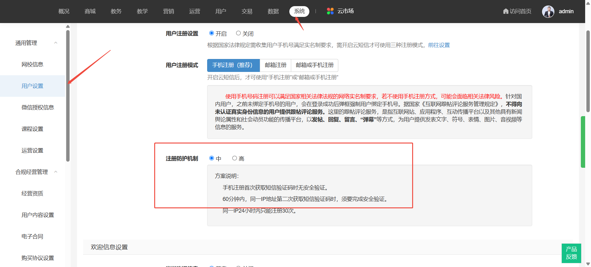 操作路径:【管理后台】——【系统】——【用户设置】——【注册】——【注册防护机制】