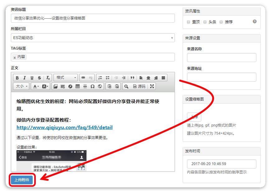 说明:如果没有“上传附件”的按钮,请先到【教育云】-【云附件设置】中开启附件并勾选“资讯”。