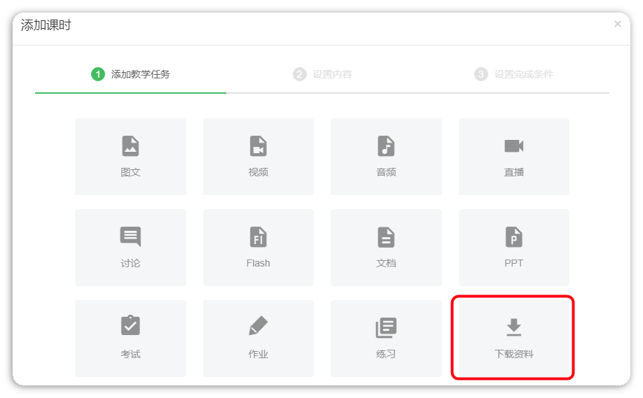 路径:【课程管理页】-【课时管理】-【添加课时】中选择【下载资料】任务类型,上传资料成功后,会自动同步显示在这门课程的资料区中,学员加入课程,即可下载资料;