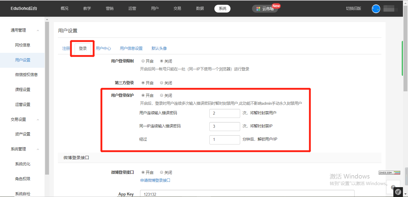 设置路径:【管理后台】-【系统】-【用户设置】-【登录】-【用户登录保护】;