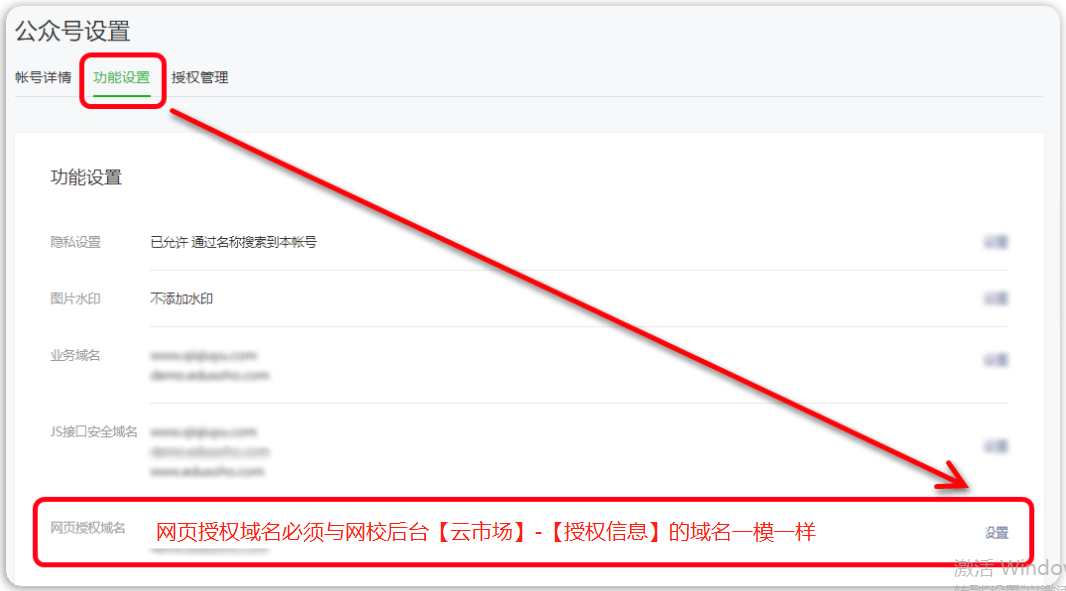 登录申请微信支付的服务号,在左侧导航栏【公众号设置】-【功能设置】中设置
