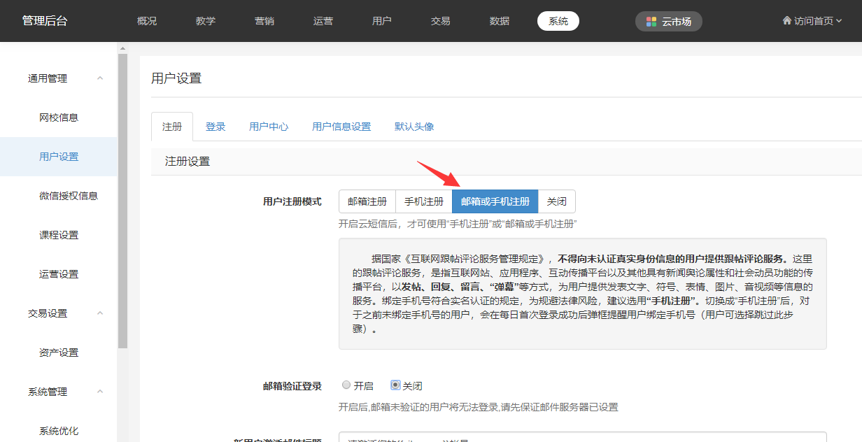 【管理后台】-【系统】-【用户设置】-【注册】注册模式选择邮箱注册,邮箱必须验证;