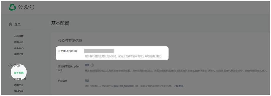 AppID:登录公众平台【mp.weixin.qq.com】->开发(下滑左侧菜单)->基本配置->公众号开发信息,即可查看到AppID。如下图: