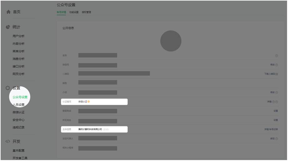 主体信息:登录公众平台【mp.weixin.qq.com】->开发(下滑左侧菜单)->设置->公众号设置,在认证情况为【微信认证】的状态下,即可查到主体信息。如下图: