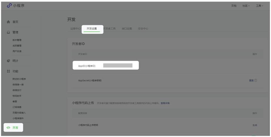 AppID:登录公众平台【mp.weixin.qq.com】->开发(下滑左侧菜单)->开发设置->开发者ID,即可查看到AppID。如下图: