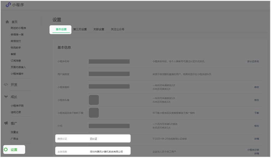 主体信息:登录公众平台【mp.weixin.qq.com】->设置(下滑左侧菜单)->基本设置,在微信认证为【已认证】的状态下,即可查到主体信息。如下图: