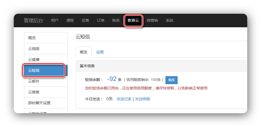 方式一: 网站【管理后台】-【教育云】-【云短信】-【概览】,可查看短信的“发送明细”和“发送记录”; 方式二: 在OPEN站登录绑定了网校的账号,进入【管理控制台】-【云短信(国内)】,可查看短信的“发送明细”和“发送记录”;