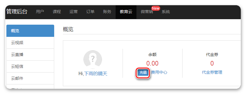 在【网校后台】-【教育云】-【概览】-【充值】点进去输入金额,可以使用支付宝支付