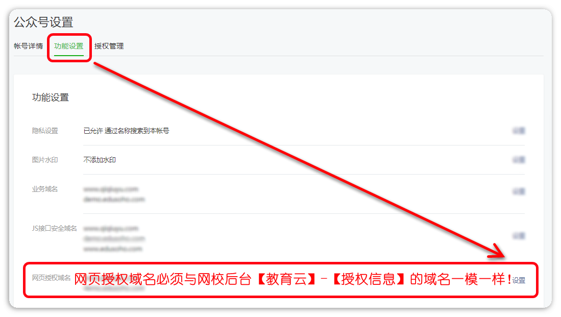 登录申请微信支付的服务号,在左侧导航栏【公众号设置】-【功能设置】中设置