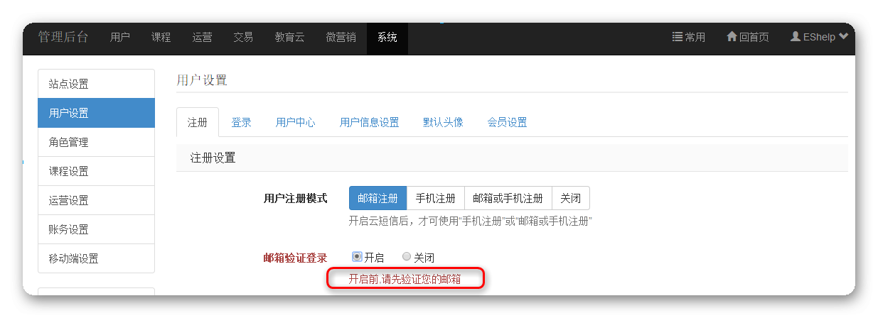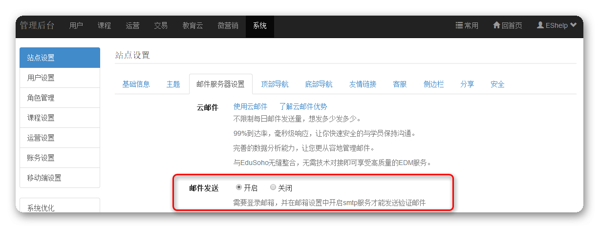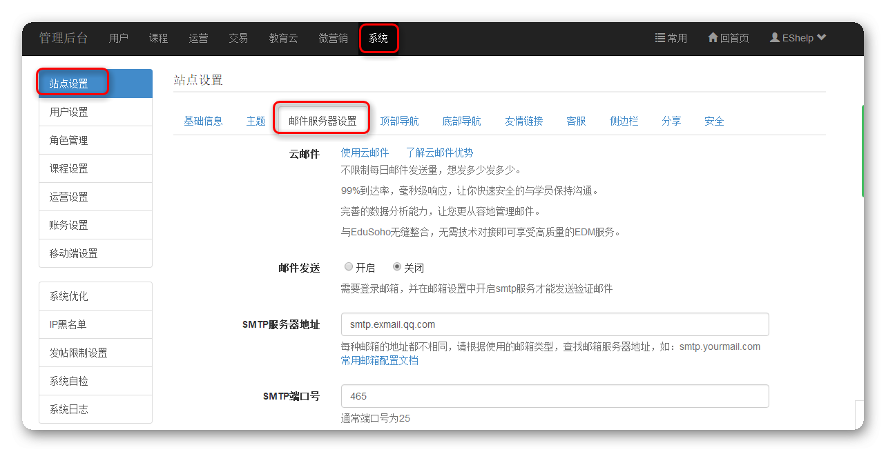 1、验证邮箱的前提是网站能发邮件,邮件服务器需要先设置好或者使用云邮件,设置路径:【管理后台】-【系统设置】-【站点设置】-【邮箱服务器配置】;