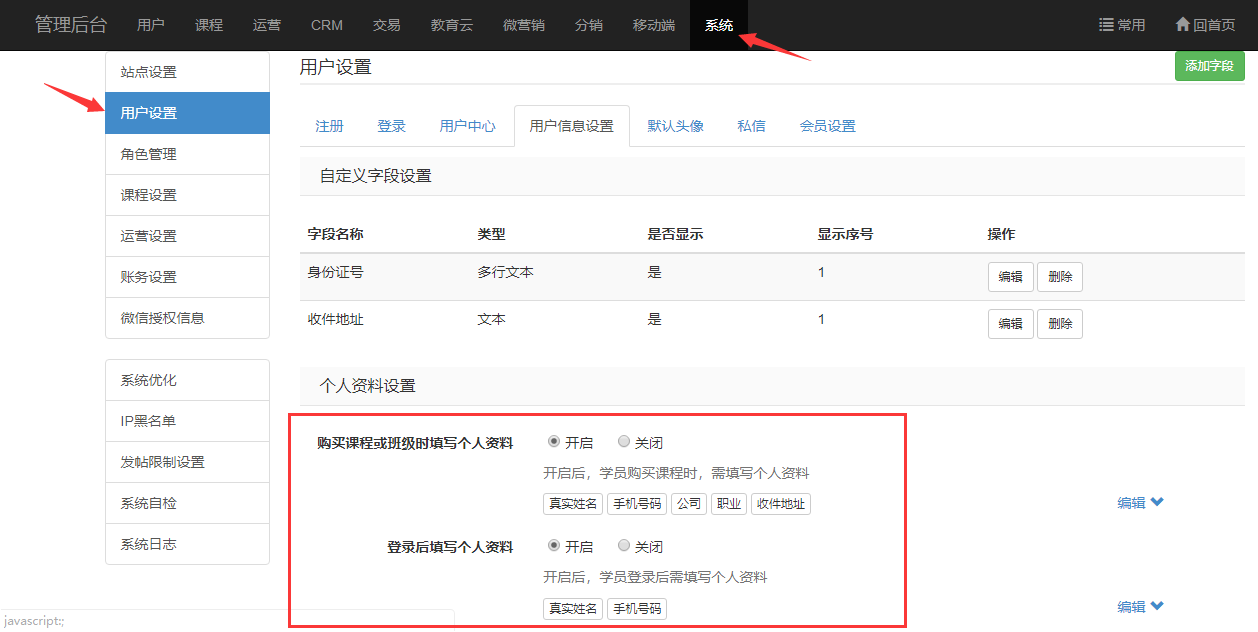 怎么获取到第三方登录的用户的邮箱或者手机号呢? 路径:【管理后台】-【系统】-【用户设置】-【用户信息设置】