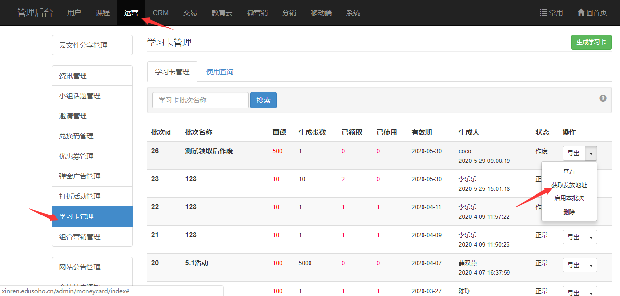 3)网校公告(【管理后台】-【运营】-【网站公告管理】),将优惠以公告形式通知用户,公告链接到学习卡发放链接;