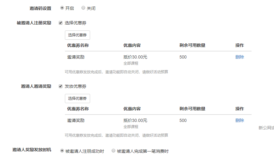目前邀请奖励发放有三种形式: 1:被邀请用户注册以后就获得奖励 2:邀请用户在被邀请用户网校有真实消费以后会获得奖励 3:邀请用户在被邀请用户注册以后就获得奖励