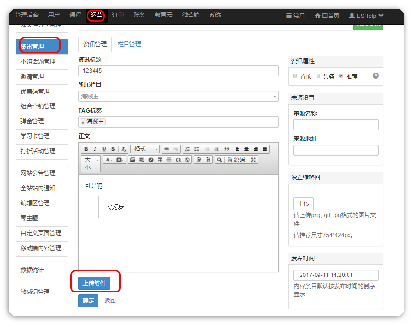 第一步:接入ES教育云,开启云附件,勾选使用范围“资讯”; 路径:【管理后台】-【教育云】-【云附件设置】; 第二步:添加新资讯或者编辑已有资讯,上传附件; 上传后,用户可以预览和下载附件,需要先登录。