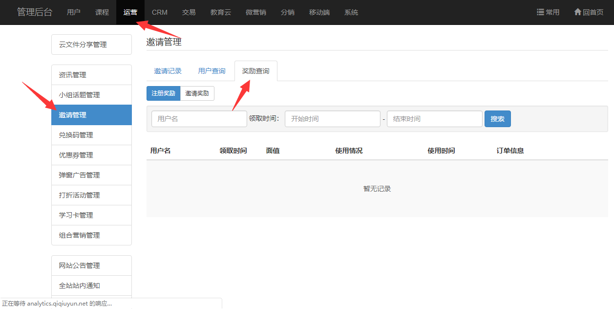 【管理后台】-【运营】-【邀请管理】-【奖励查询】可以查看邀请奖励的优惠券领取和使用情况。