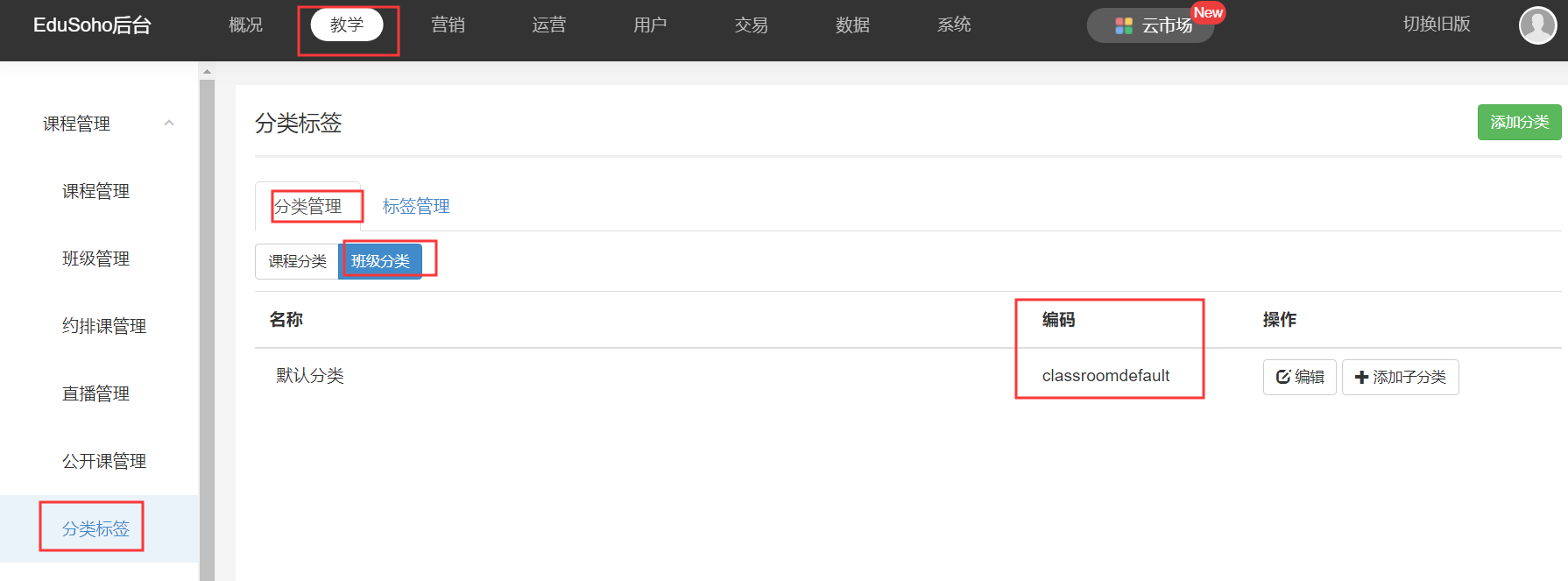 【管理后台】-【教学】-【分类标签】-【分类管理】-【班级分类】,可以看到各个分类的编码,这些编码是在创建分类的时候设置的,可以再次编辑修改,作用就是区分不同分类。
